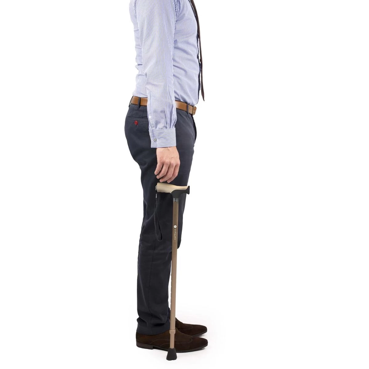 De wandelstok biedt bijzonder veel comfort en veiligheid tijdens het lopen. De zachte bovenkant van het handvat ligt prettig in de hand en helpt schokken op te vangen. Inclusief polsbandje. De wandelstokdop is speciaal ontwikkeld om tijdens het lopen een vloeiende beweging te krijgen. De individuele hoogteinstellingen maken de wandelstok geschikt voor comfortabel gebruik door iedereen. Stel de wandelstok in op de juiste hoogte door het handvat van de wandelstok gelijk te houden met de pols, wanneer de arm langs het lichaam hangt.